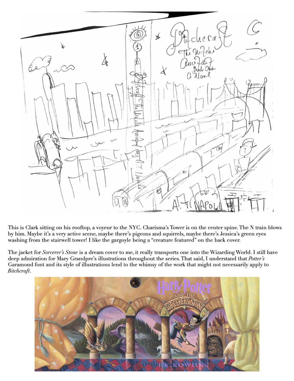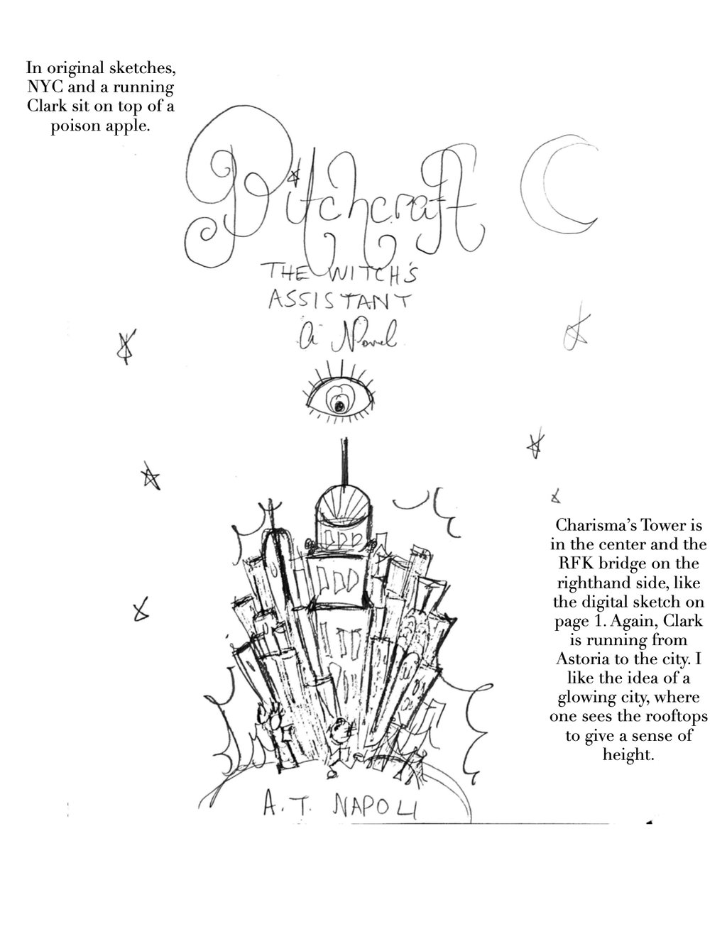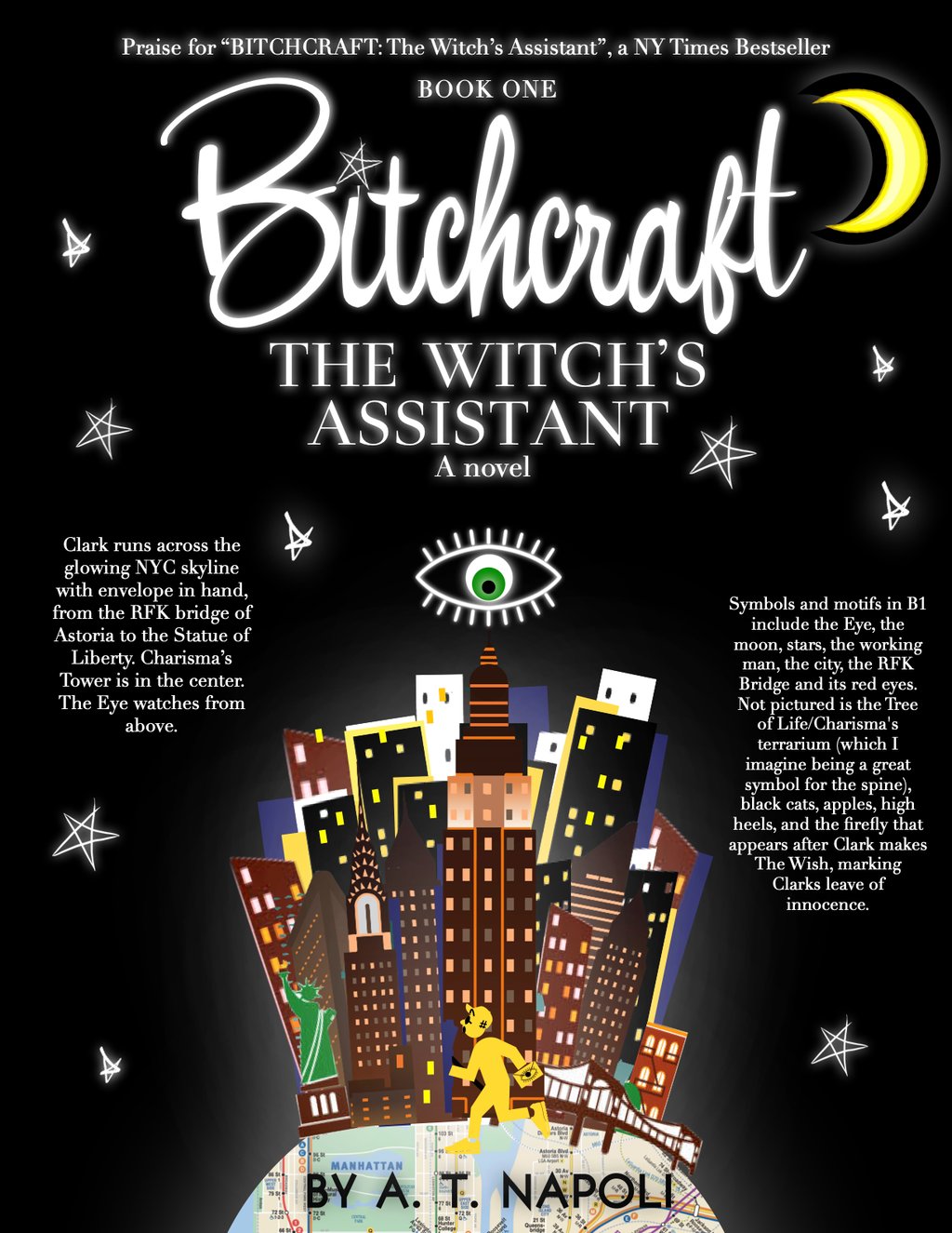 I doodled this running-cover idea quickly and reproduced it on Pages, noting that in the original drafts, Clark runs on a poison apple-globe (zoomed out)—all a bit busier than need be! But I loved the All-Seeing Eye looking down and the MTA map, running from Astoria to the Upper East Side. The stars are hand-drawn and used throughout this website. We love a twinkle.✨