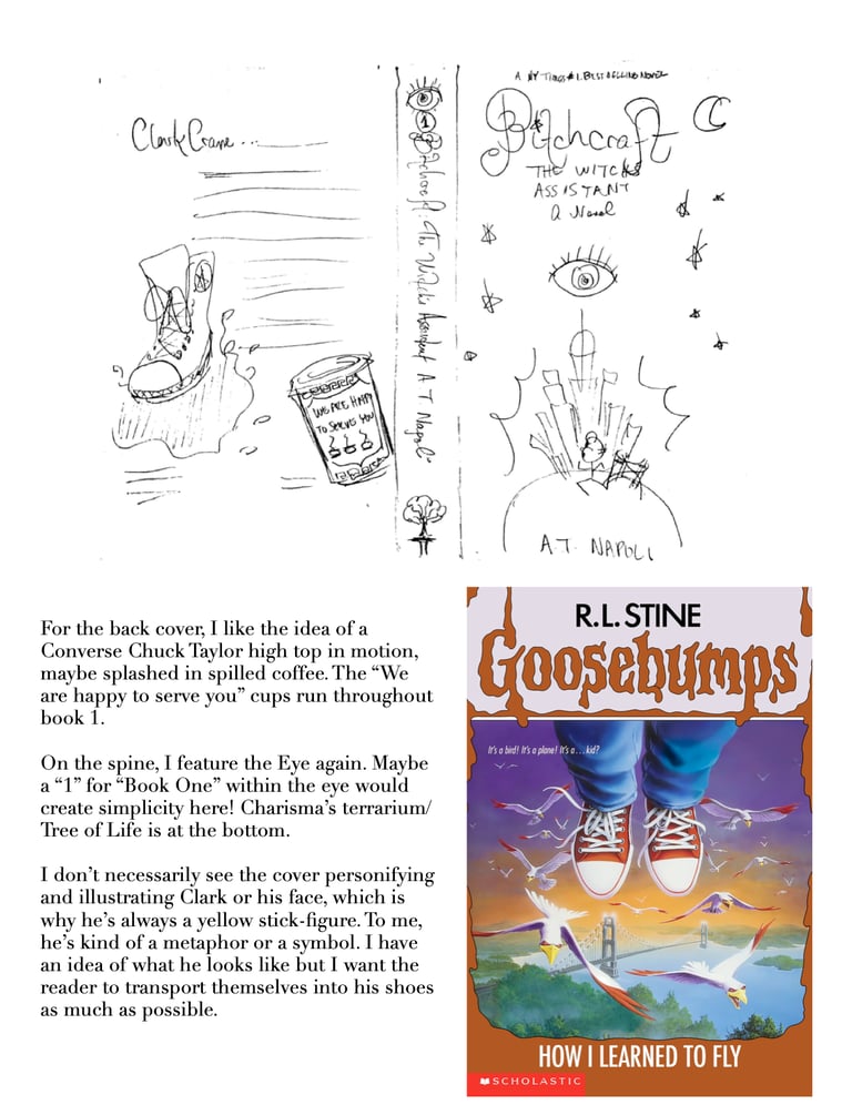 One back cover idea in the collage above shows Clark's Chuck Taylor Converse splashing through spilled milk and cawfee. A classic "We are happy to serve you" (ominous! spooky!) blue and white coffee cup — the kind Clark knows all too well from Astoria Coffee Shoppe and iconic amongst the Tristate's many bodegas and delis — deserves a special mention, too. Although I even mention in my notes how I don't necessarily require that Clark have a highly discernible face, now I wonder what my cover designer, Lisa Marie Pompilio, would've come up with.